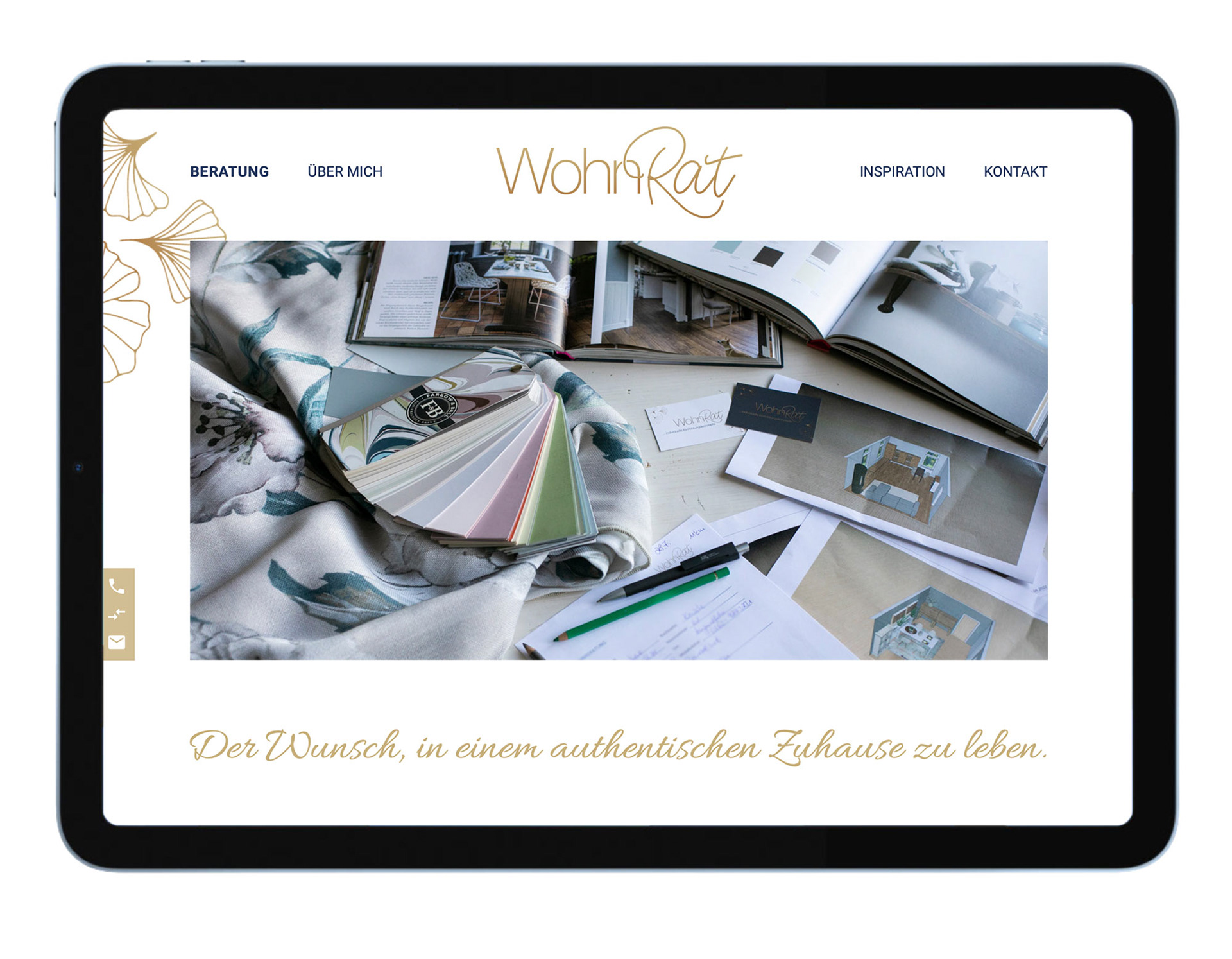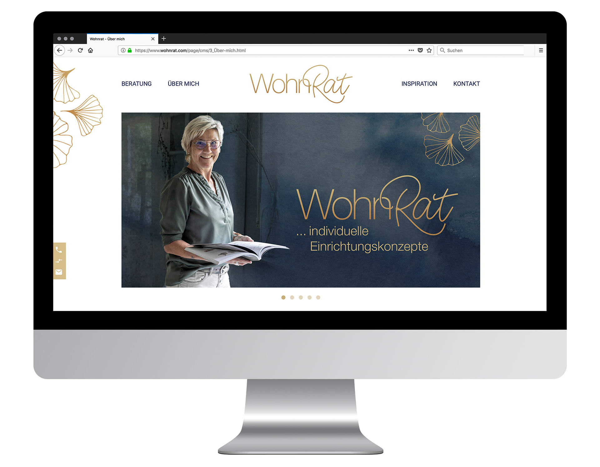Elisabeth Engelmann arbeitet als Wohnberaterin die individuellen Bedürfnisse ihrer Kunden heraus, entwickelt neue Ideen – berücksichtigt dabei auch Bestehendes und gibt diesem einen neuen Platz. „Wohn“ als starres Element in der Bildmarke, in Kombination mit dem flexiblen „Rat“ spiegelt diese Philosophie wider. Als Schmuckelement habe ich Ginkgo-Blätter gewählt, da sie im Feng-Shui als Symbol für Yin (Sanftheit) & Yang (Lebenskraft) stehen. Corporate Design | Wortmarke | Zeichnung Ginkgo-Blätter Visitenkarte mit Druckveredelung | Layout & Grafik der Website | Fotomontage
